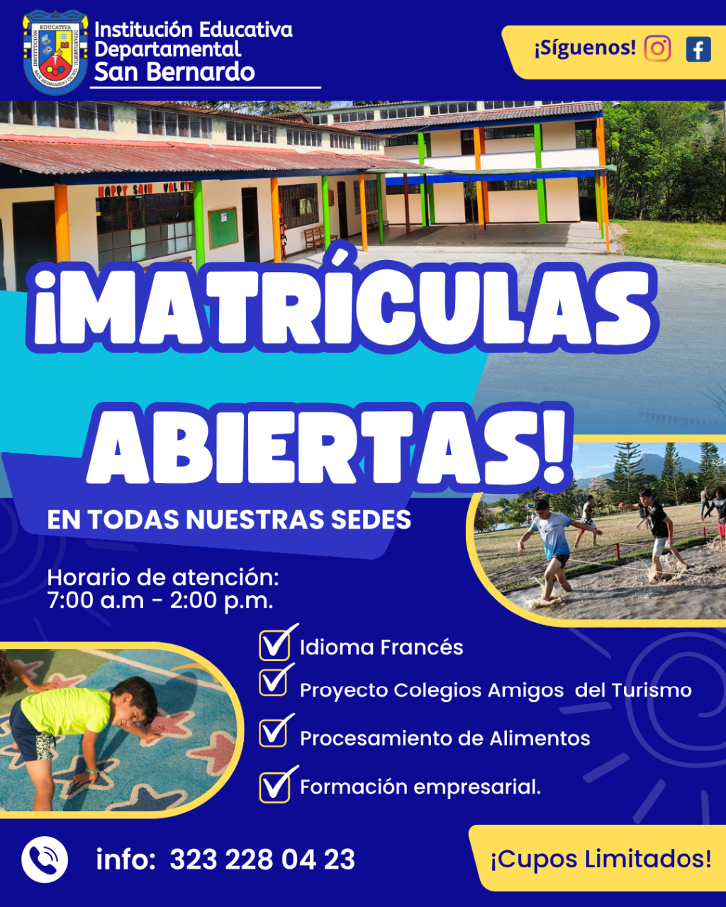 La IED San Bernardo es una institución de educación pública de educación general al servicio del municipio, la región y el país que se ha propuesto como metas principales la formación empresarios lideres mediante la implementación de un currículo que abarca todas las áreas del saber necesarias para tal propósito siendo de vital soporte las áreas técnicas y la modernización de las prácticas pedagógicas, para que los egresados puedan vincularse de manera efectiva al sector productivo generando sus propias fuentes de trabajo, mejorando su calidad de vida y la de la comunidad; generando además entre sus educandos, la convivencia armónica y pacífica como personas íntegras que asumen su papel con valores, ética, calidad y eficiencia.